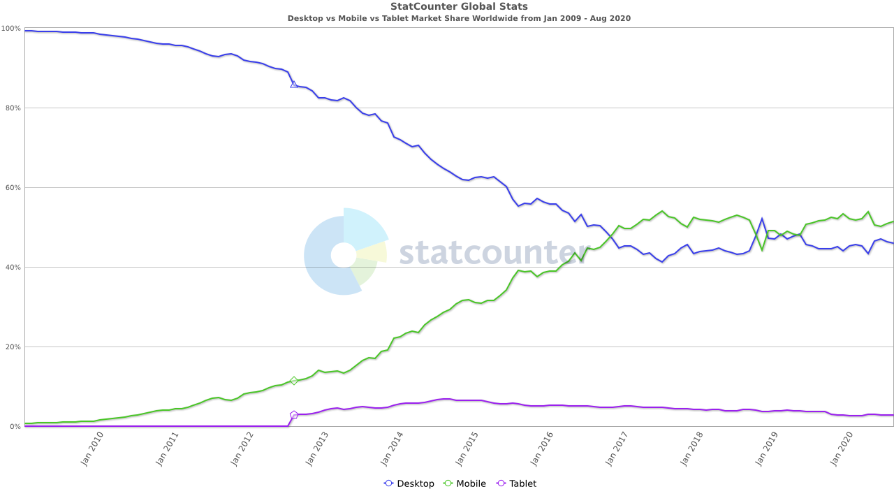 현재 전세계의 웹사이트 중 반응형 웹사이트의 비중은 알 수 없지만, 2016년 말을 기점으로 사람들은 Desktop(Laptop을 포함한)보다 Mobile로 웹 서치를 더 많이 하고 있음을 알 수 있다. 개발자에겐 이 데이터가 바로 반응형 웹 디자인을 공부하는 동기부여가 되고, 창업가들에겐 반응형으로 웹 사이트를 디자인하는 계기가 되길 바래본다.