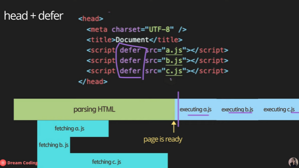 defer도 async처럼 비동기적으로 파싱되는 것은 맞으나, HTML 파싱이 끝난 후 스크립트가 실행된다.