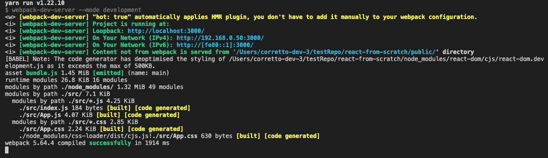 yarn add -D webpack@5.64.4 webpack-cli@4.9.2 webpack-dev-server@4.6.0 style-loader@3.3.1 css-loader@6.5.1 babel-loader@8.2.3 react-hot-loader@4.13.0