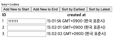 여기서 맨 앞에 값을 추가해보면, 입력하지 않았음에도 index가 같기 떄문에 ID 1에 입력된 값 '11111'이 입력되어 있는 것을 확인할 수 있습니다.. 이처럼 사용자가 컴퍼넌트에 잘못된 key 값을 입력하면 UI 버그가 생길 수 있습니다.