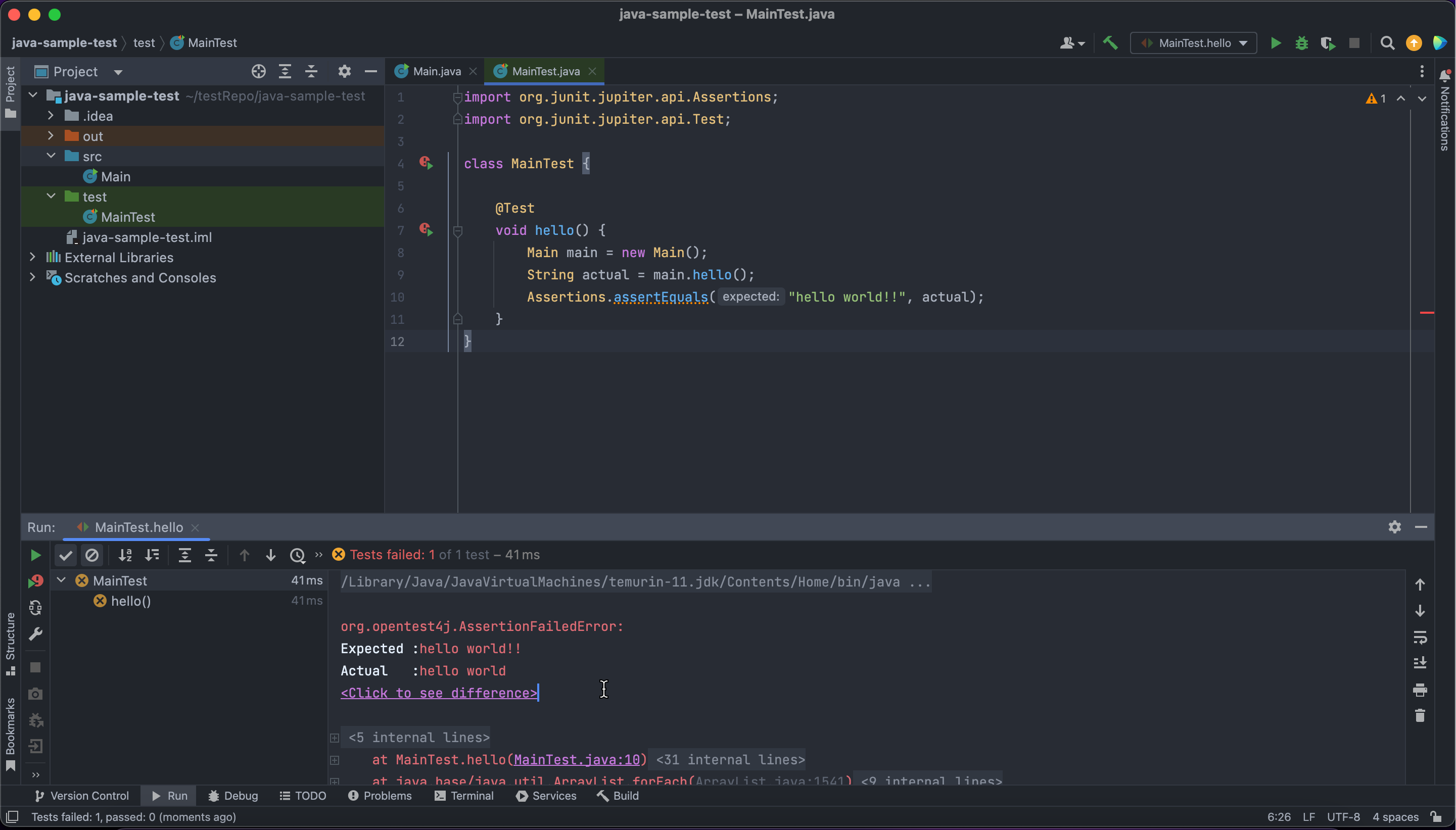 Assertions.assertEquals("hello world", main.hello());