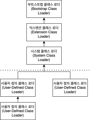 - 사용자 정의 클래스 로더(User-Defined Class Loader) : 애플리케이션 사용자가 직접 코드 상에서 생성하여 사용하는 클래스 로더를 말한다.