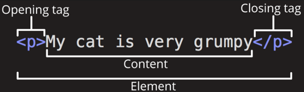 먼저 HTML(Hyper Text Markup Language)이란 웹 사이트의 기본 정보에 속하는 마크업 언어이다. Hyper Text란 간단히 말하여, 링크와 같이 다른 사이트를 참조할 수 있는 형식의 문자를 말한다. 웹에서 수많은 정보들이 연관되고 참조되는 모습을 우리는 쉽게 상상할 수 있으리라. 또한 마크업 언어란 <p></p>와 같이, 여는 태그와 닫는 태그로 이루어진 것들을 말하며, 아래와 같이 태그 안에 들어가는 정보와 태그로 구성된다.