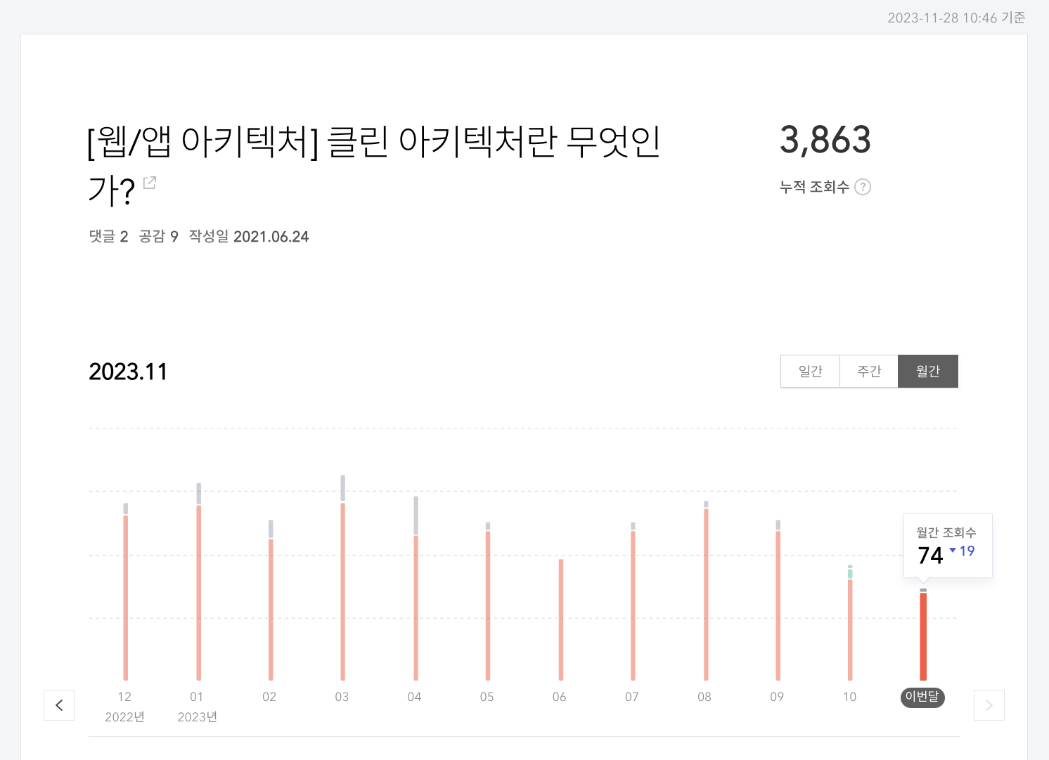 두번째는 제 학습에 도움이 될 법한 주제들을 정리해왔습니다. 대표적으로 로버트 C. 마틴의 클린 아키텍처란 책을 읽고 정리하여, 생활코딩 채널에 공유해보기도 했습니다. 제가 쓴 글을 많은 사람들에게 홍보할 때의 그 기분은 제가 개발한 프로그램을 배포하고 실 사용자들에게 피드백을 받길 기다리는 설렘이 있었네요. 첫번째 유형보다 글 작성에 든 시간은 2-3배 정도였지만, 글을 쓰고 난 뒤 개발할 때 많은 도움이 되었습니다.
