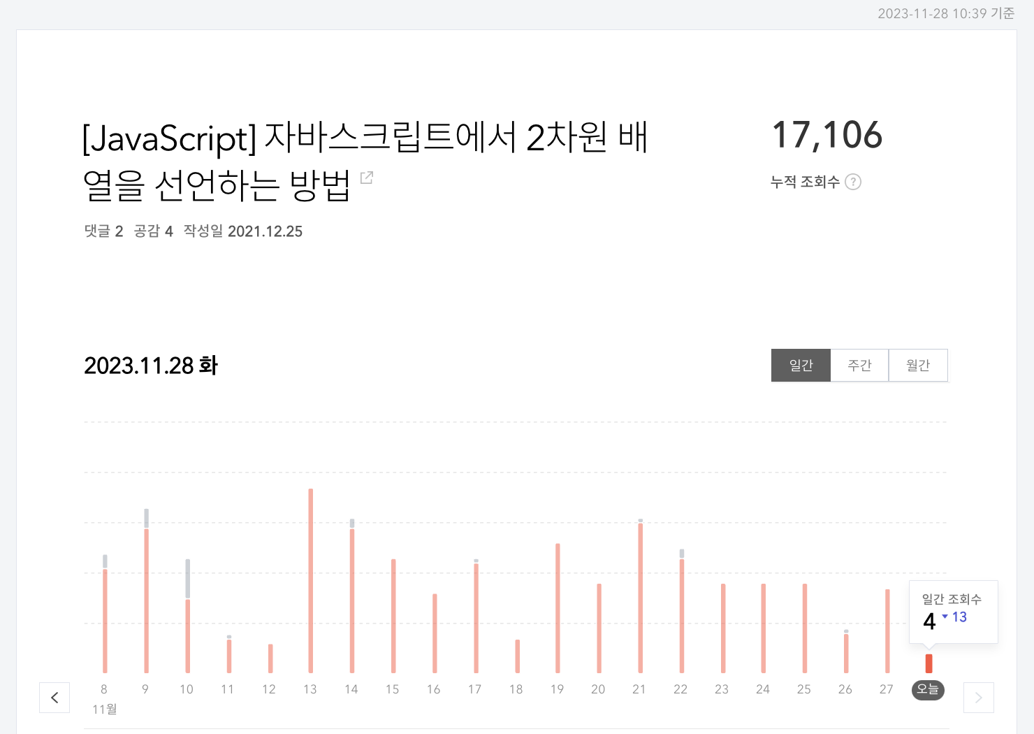 저는 두 가지 유형의 글을 써왔습니다. 첫번쨰는 사람들이 검색해서 찾아 볼법한 주제들을 정리해왔습니다. 예를 들면, CSS로 버튼 클릭으로 메뉴 화면 보이기/감추기와 같은 글과 자바스크립트에서 2차원 배열을 선언하는 방법과 같이 프로그래밍할 때 생기는 궁금증을 간단하게 해결하는 글들을 작성했습니다. 제가 처음 개발을 프론트엔드 개발을 위주로 해왔기 때문에, 첫 1년에서 1년 반은 프론트엔드 개발과 관련된 주제들이 많았네요. 해당 글들의 특성은 글 작성은 쉬운데, 블로그 조회수는 높은 효자 같은 글입니다. 다만, 기술적 깊이가 얕기 때문에 제 개인의 학습에 큰 도움은 되지 않았습니다.