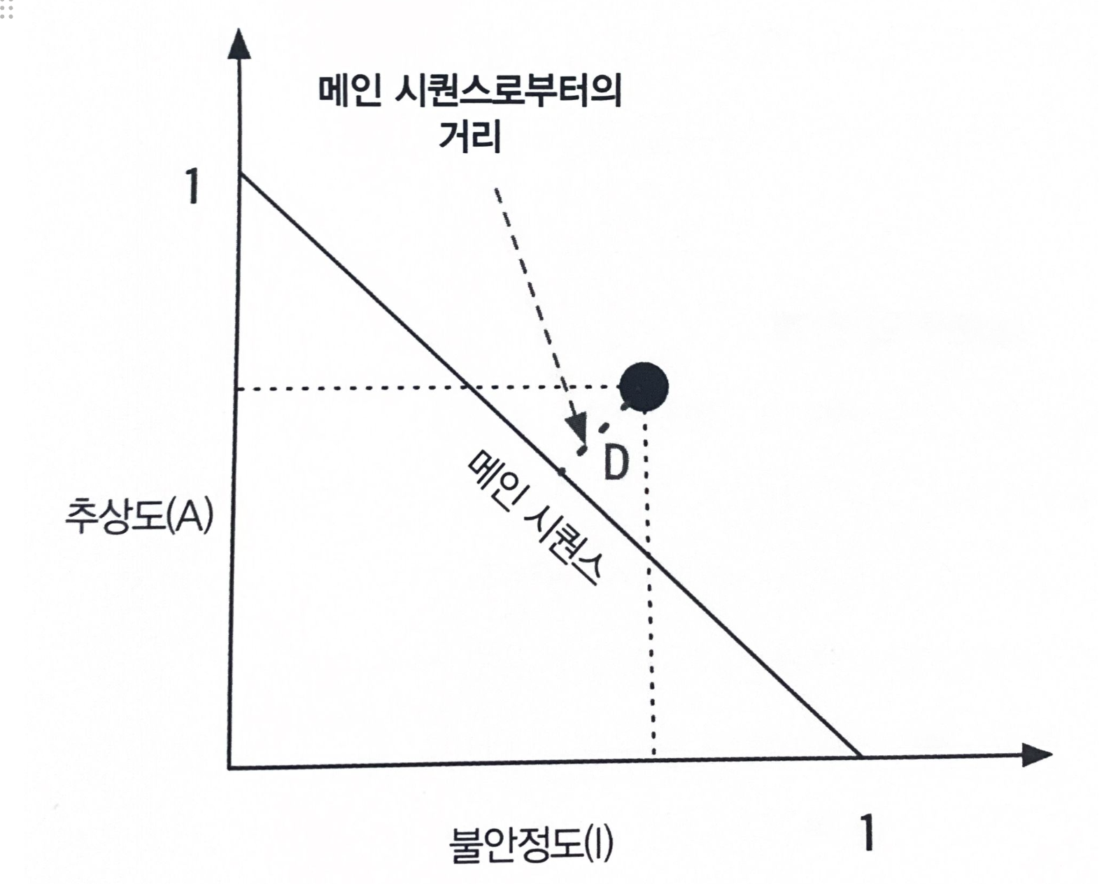 메인 시퀀스로부터의 거리는 아키텍처 구조를 평가하는 몇 가지 전체적인 매트릭 중 하나로, 불안정도와 추상도를 이용하여 계산한다.
