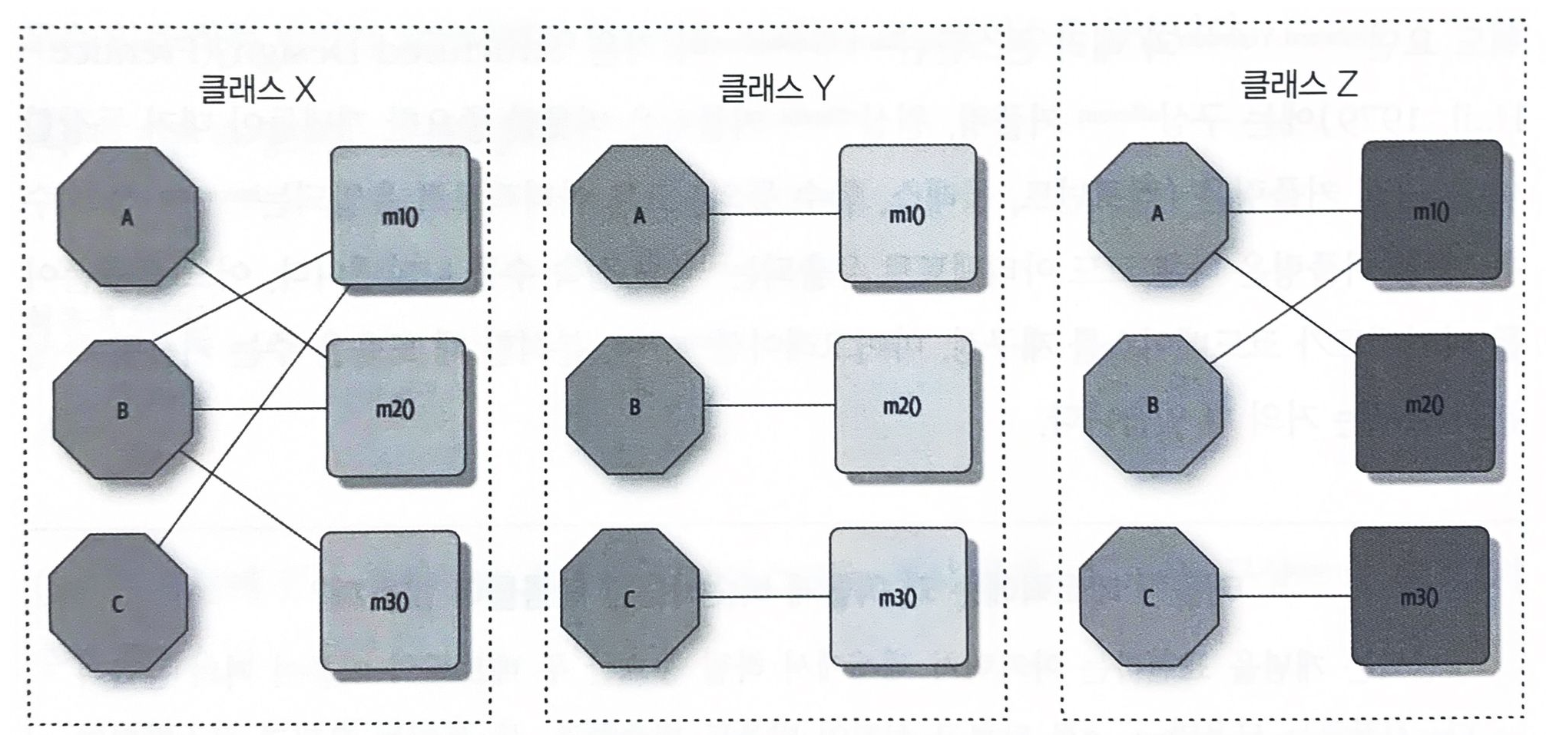 클래스 X는 구조적 응집이 우수한 반면, 클래스 Y는 응집이 결여되어 있다. 클래스 Y의 필드/메서드 세 쌍은 각자 자기 클래스에 두어도 별로 상관이 없을 듯 하다. 클래스 Z는 응집이 조합된 모양새로, 세 번째 필드/메서드 쌍은 개발자가 자체 클래스로 빼도 된다.