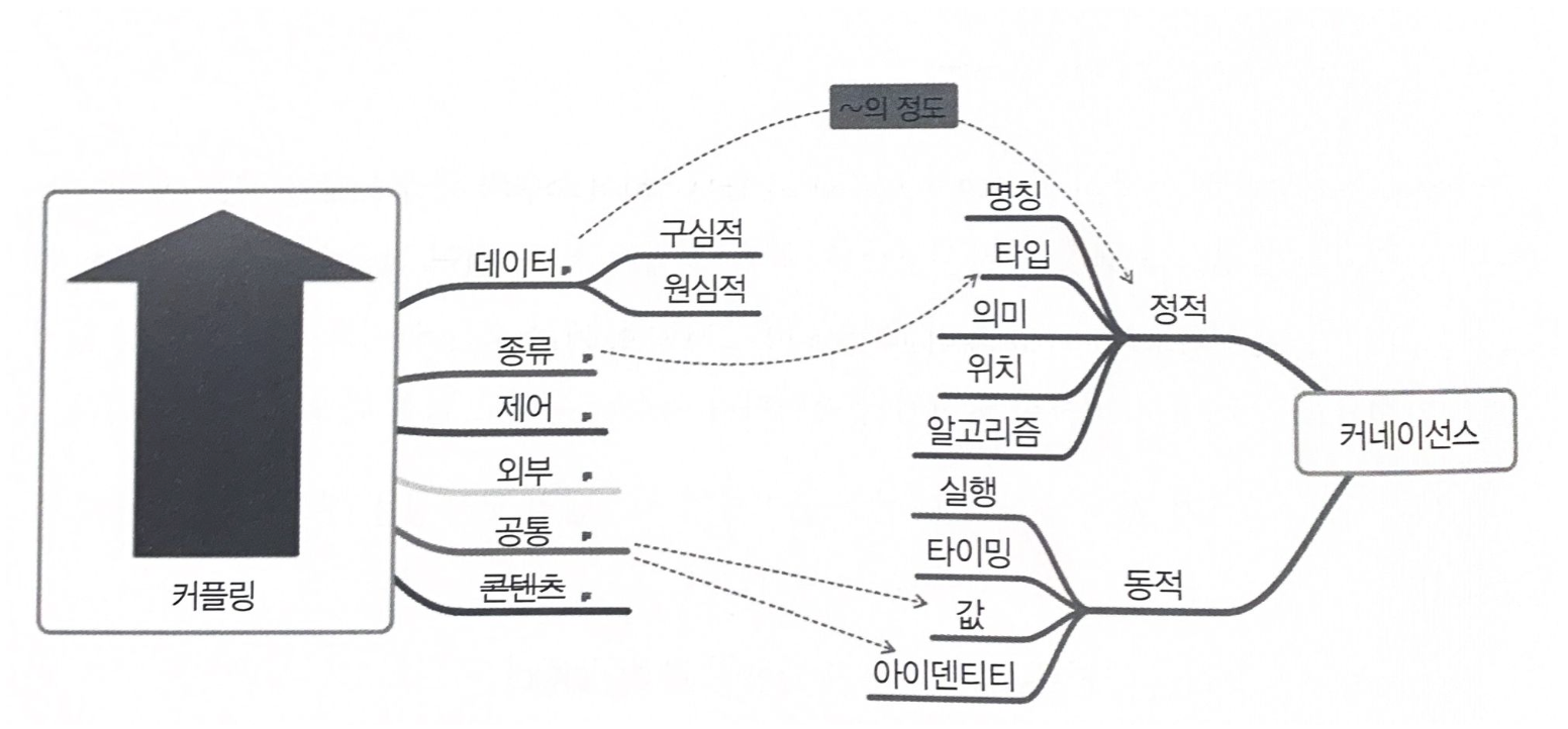 구조적 프로그래밍의 커플링 개념은 왼쪽, 커네이선스 특성은 오른쪽에 표시되어 있다. 구조적 프로그래밍에서 데이터 커플링(메서드 호출)이라고 부르는 커네이선스는 커플링이 어떻게 나타나야하는지 알려준다.