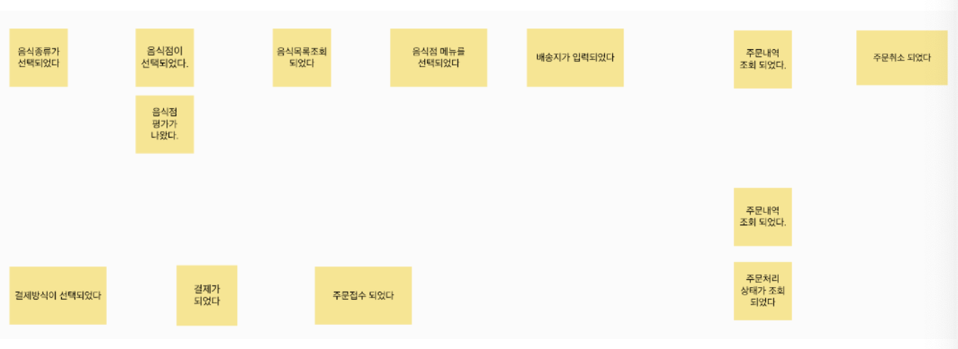 - 연습은 참가자가 도메인 이벤트를 식별하는 것에서 시작한다. 이벤트는 주황색.