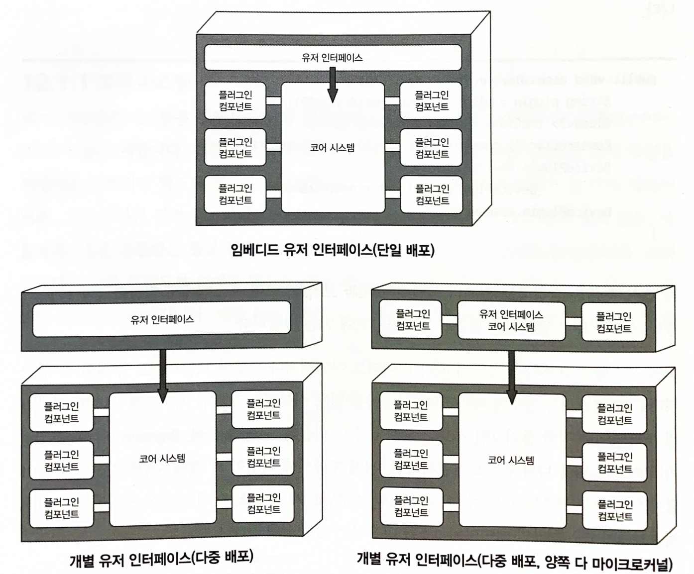 실제로 별도의 UI를 마이크로커널 아키텍처 스타일로 구현할 수도 있다. 위의 그림은 코어 시스템에 대해 프레젠테이션 레이어를 구성하는 세 가지 변형이다.