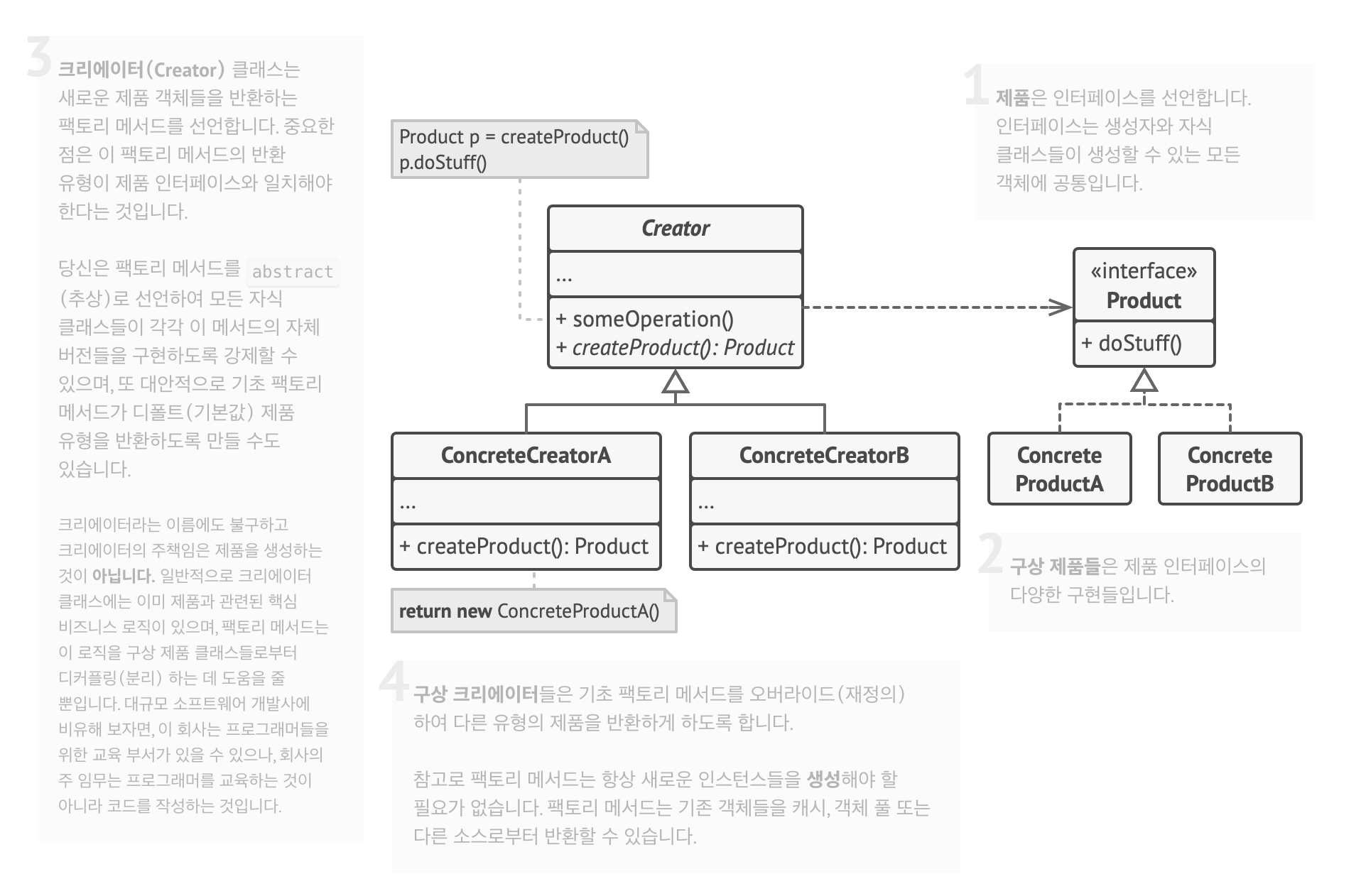 팩토리메서드 패턴은 아래와 같은 정의, 장점, 단점, 쓰이는 용례가 존재한다.