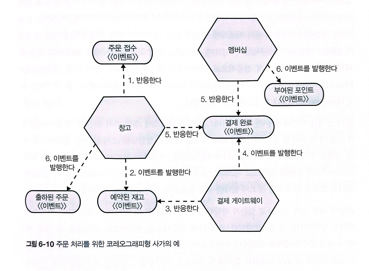 - 주문(Order) 경계와 결제(Payment) 경계는 주문 생성 후 결제 상태를 처리하기 위해 상호작용합니다. 이 때, "주문 생성" 이벤트가 발생하면 "결제 승인"이 필요한 상황이 생긴다.