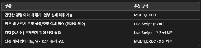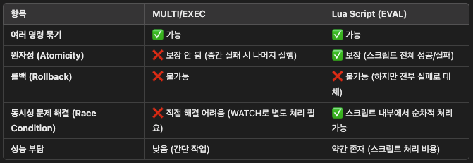 Redis에서 단일 명령은 항상 원자적이다. 그렇지만 Redis의 트랜잭션(MULTI/EXEC)만으로는 원자성(Atomicity)이 완전히 보장되지 않는다. 이를 보장하려면 Lua 스크립트를 사용하면 진정한 의미의 원자성이 보장할 수 있다.