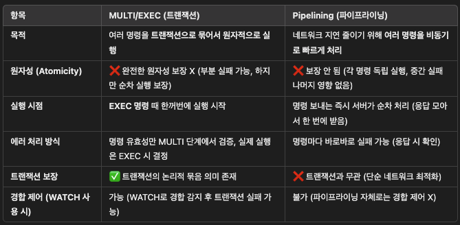 추가로 Redis Pipelining과 MULTI/EXCE의 차이점에 대해서 알아보자. 둘 다 여러 명령 모아서 보낸다는 점에서 공통점이 있다. 그렇지만 아래와 같은 차이점이 존재한다.