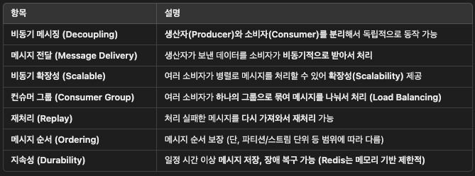 - Redis는 메시지 큐로 사용할 수 있으며, Pub/Sub 모델을 통해 실시간 메시징을 처리할 수 있다. 여러 클라이언트가 서로 메시지를 발행하고 구독할 수 있어 실시간 알림 시스템이나 이벤트 기반 시스템에 유용하다.