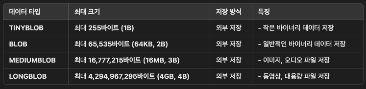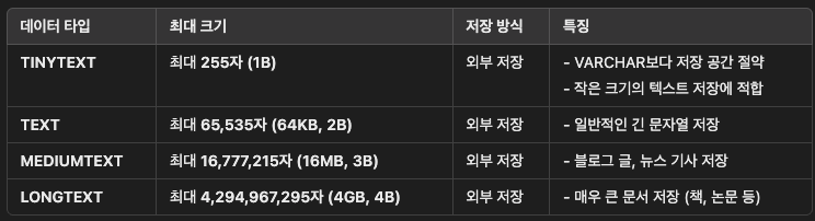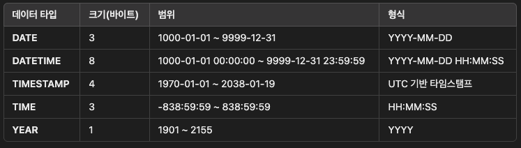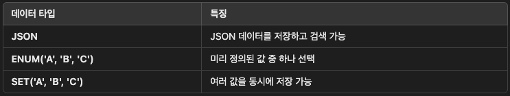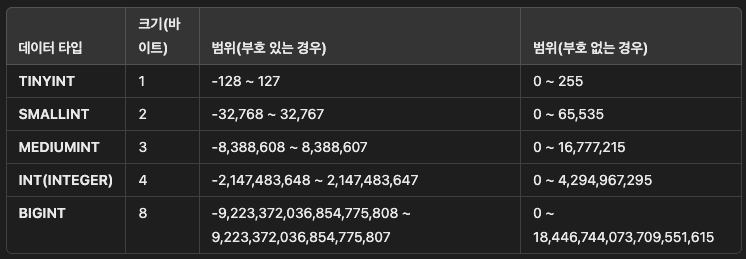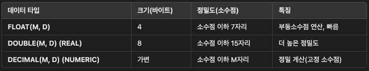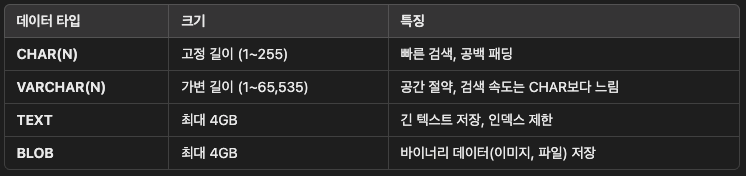 - MySQL의 주요 데이터 타입(정수, 문자열, 날짜 등)은 어떤 것들이 있고, 언제 어떤 타입을 선택해야 하는가?