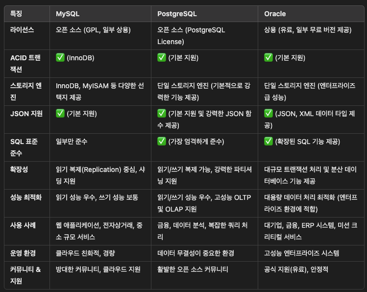 MySQL과 다른 RDBMS(예: PostgreSQL, Oracle)와의 차이점은 무엇인가?