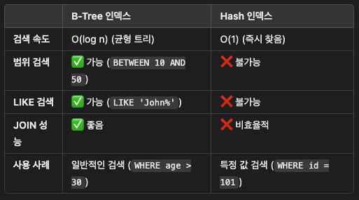 - B-Tree 인덱스와 Hash 인덱스의 차이점은 무엇인가?