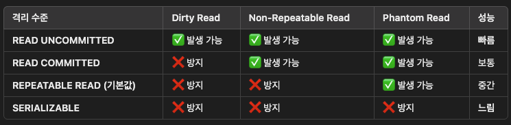 - 트랜잭션 격리 수준(READ UNCOMMITTED, READ COMMITTED, REPEATABLE READ, SERIALIZABLE)은 어떤 차이가 있는가?