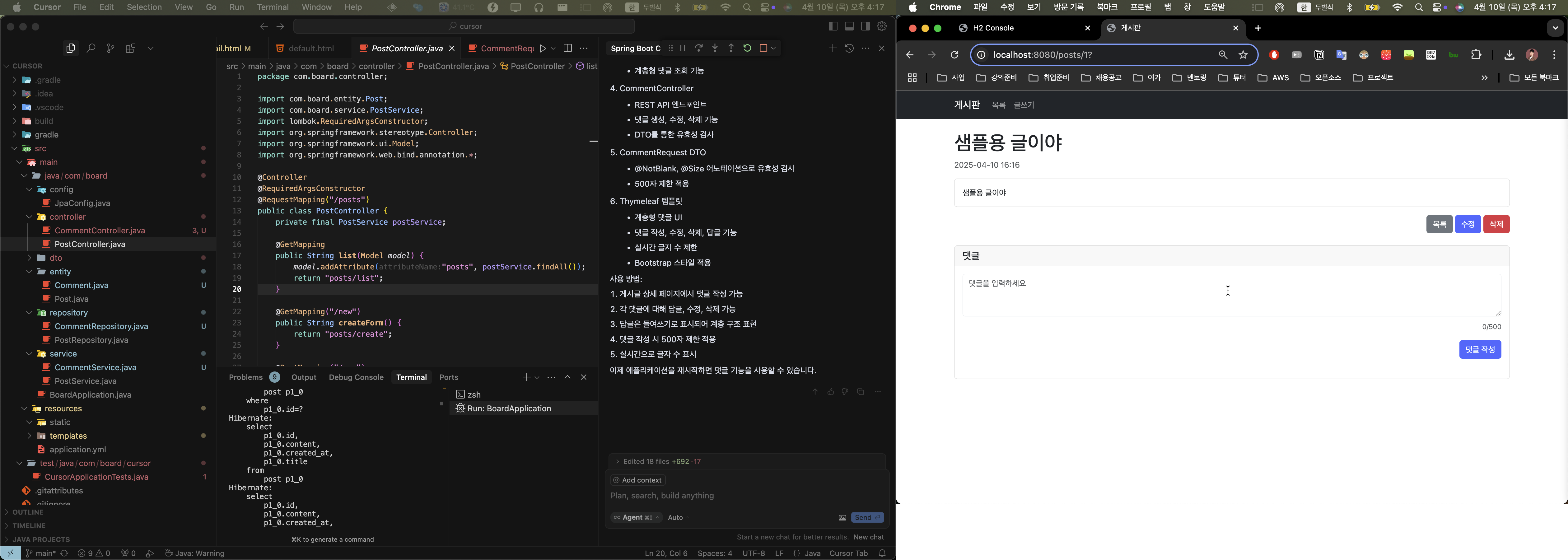 "Post와 독립적인 새로운 도메인(Comment)을 추가하는 경우, Cursor가 구조 설계부터 API 생성까지 충분히 커버할 수 있을 것이다."