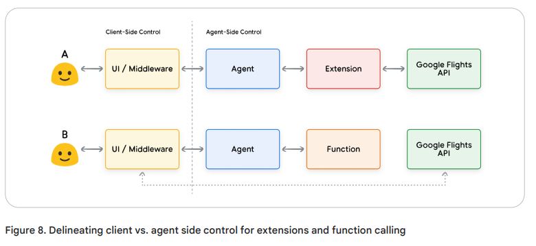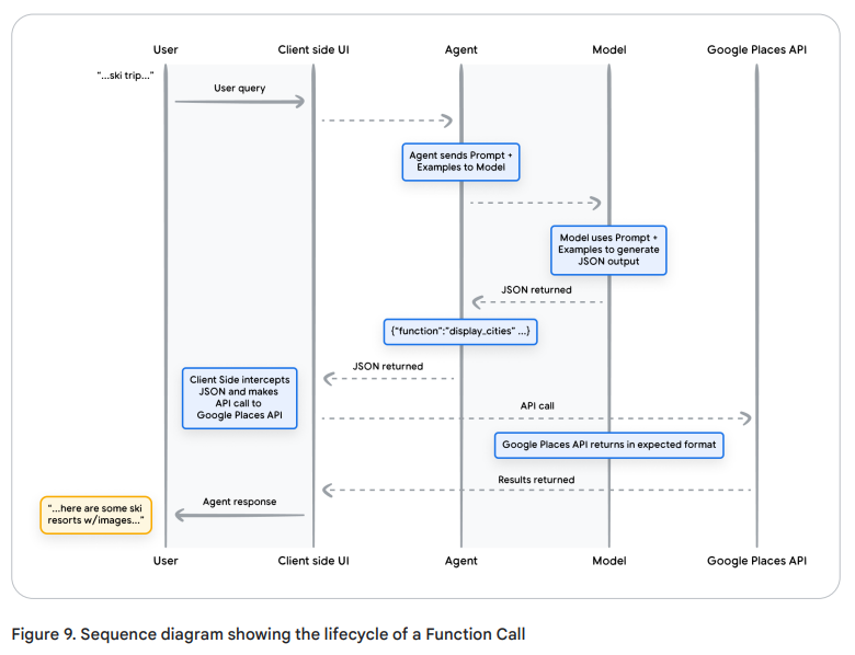 5. 최종 응답이 사용자에게 전송됩니다.요약하자면, Tool은 에이전트가 외부 세계와 상호작용하는 데 필요한 기본적인 연결 고리이며, Extension은 API와의 상호작용을 표준화하여 에이전트 측에서 실행되는 방식, Function은 API 호출 실행을 클라이언트 측으로 위임하여 개발자에게 더 많은 제어 권한을 부여하는 방식, 그리고 Data Store는 에이전트가 실시간의 다양한 데이터 소스에 접근하여 지식을 확장할 수 있도록 하는 메커니즘입니다.