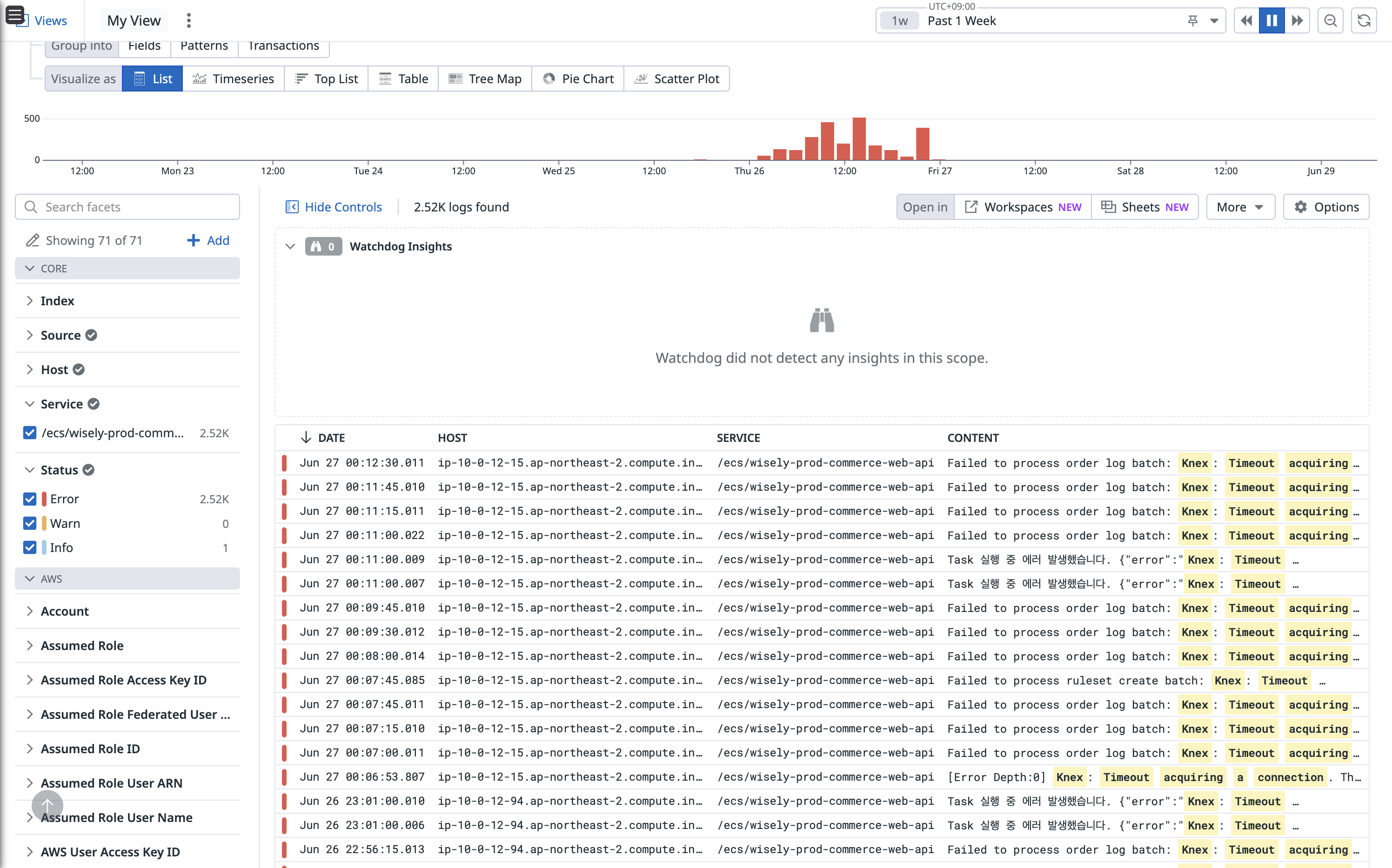 이 DbMonitoringService를 모듈에 등록하면, 1분마다 DB 커넥션 풀의 상세 상태가 JSON 형식으로 로그에 남게 됩니다. 이 로그를 Datadog에서 파싱하여 db_pool.usedCount, db_pool.pendingAcquires 등의 메트릭을 시간대별 그래프로 만들면, 장애 발생 시점의 풀 상태를 명확하게 확인할 수 있습니다.
